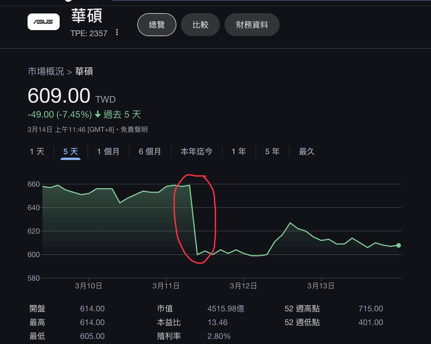 法說會隔天,股價直接跌掉了9%,圖為近5日股價走勢圖,顯示投資市場沒人預料有這事發生