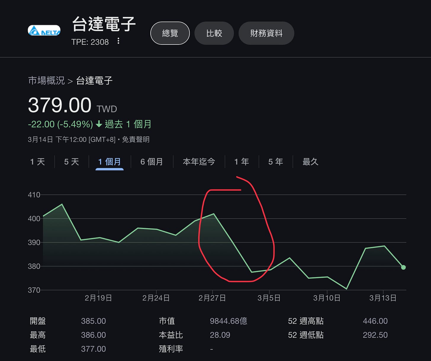 台達電(2308)泰達電重摔!台達電跌破4字頭 上季財不如預期。