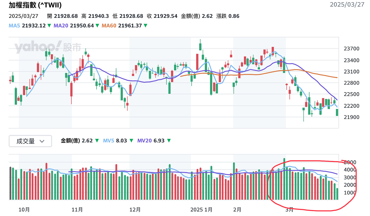 昨天3/26(周三),台股交易量縮到17個月的新低點,成交量僅僅只有2140億元,這就是一個平淡無奇、沒什麼買賣盤的市場。沒有一方表態,最近除了原物料、銅鋁業等有買盤,但台股以半導體及電子相關撐起半邊天的地方,似乎沒什麼人想進場。